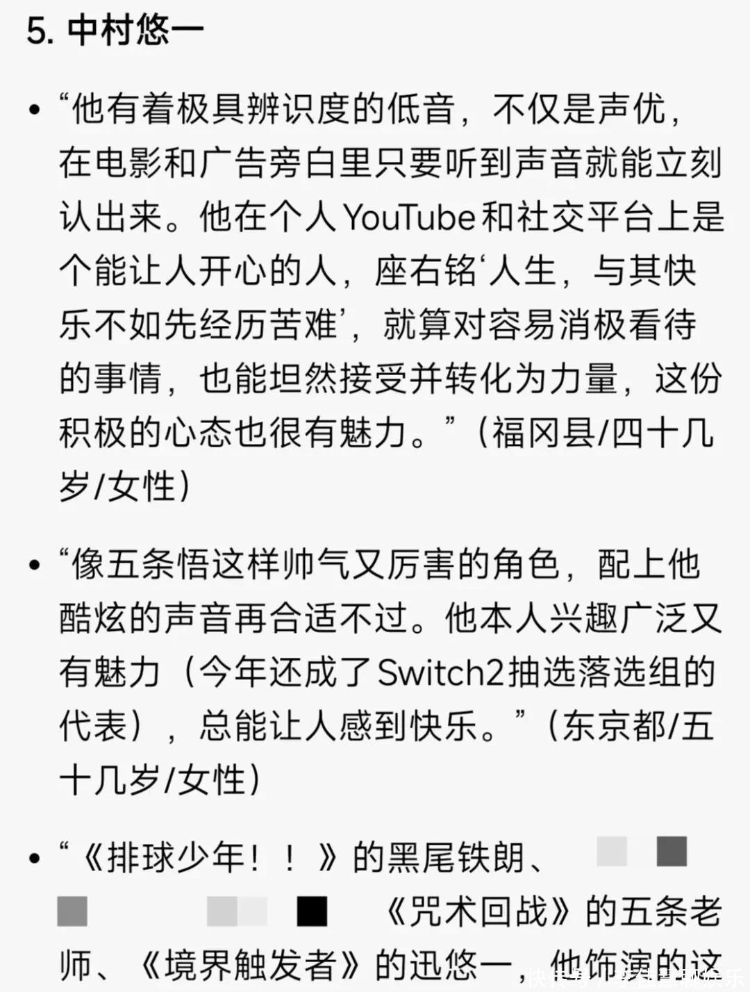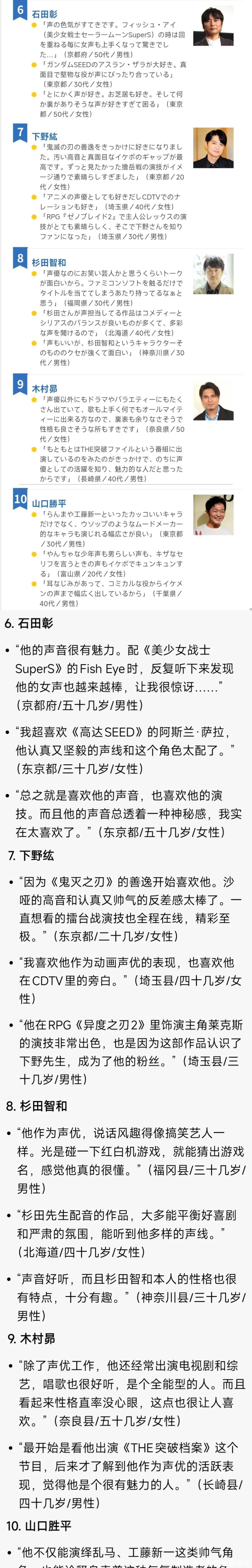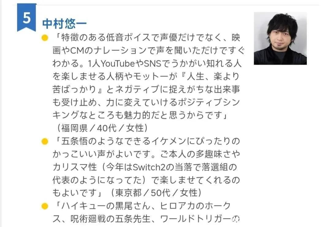 论经历和声线的话,樱井孝宏也许也能上榜——虽然东说念主品真实是堪忧,但单论声线、演技和东说念主气,再加上本年还有无尽城电影的加成,他正本也许应该在榜单上占据弹丸之地,但谁让他作念了赖事呢。