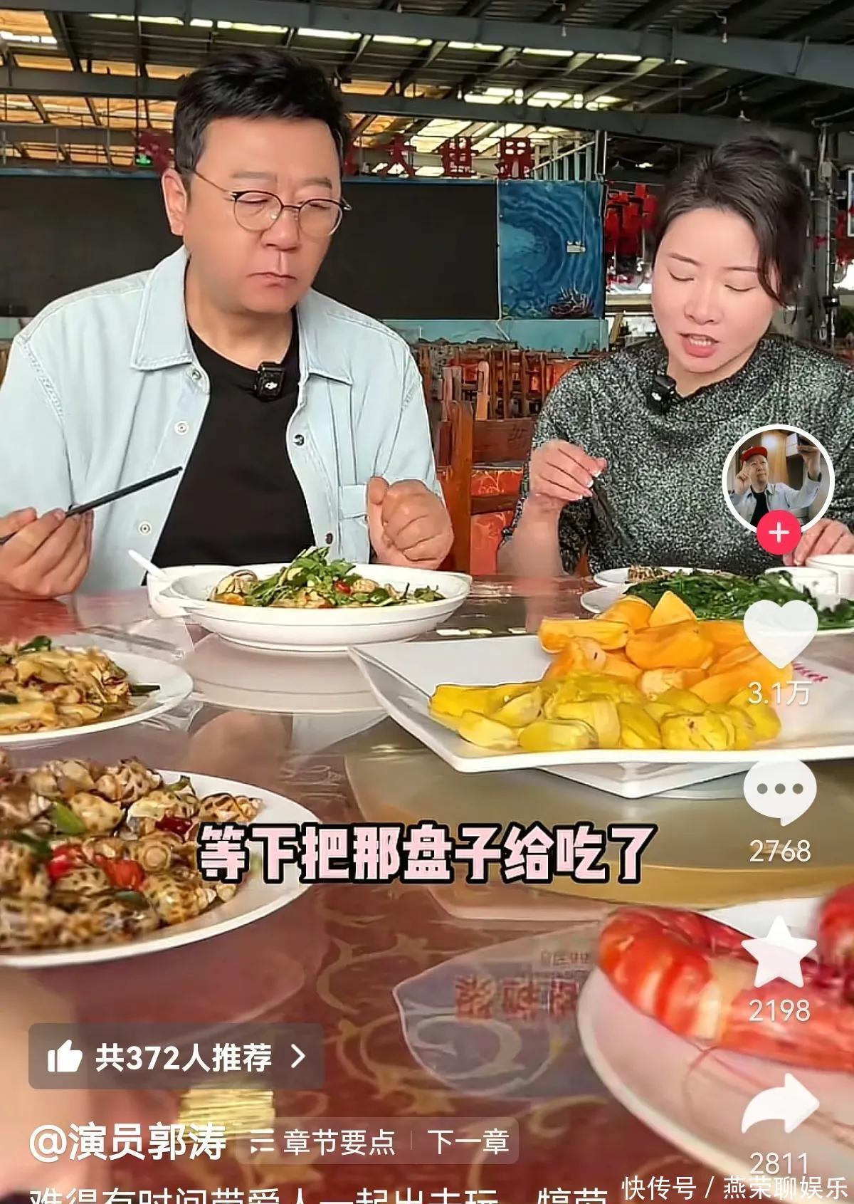 郭涛和李燃一边品味着海鲜,一边吃榴莲蜜和菠萝蜜,女方还频频地喂郭涛虾肉,间或帮他擦一下嘴,尽显老汉老妻之间的默契与深情。